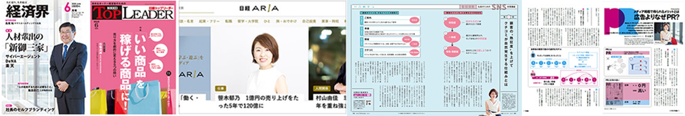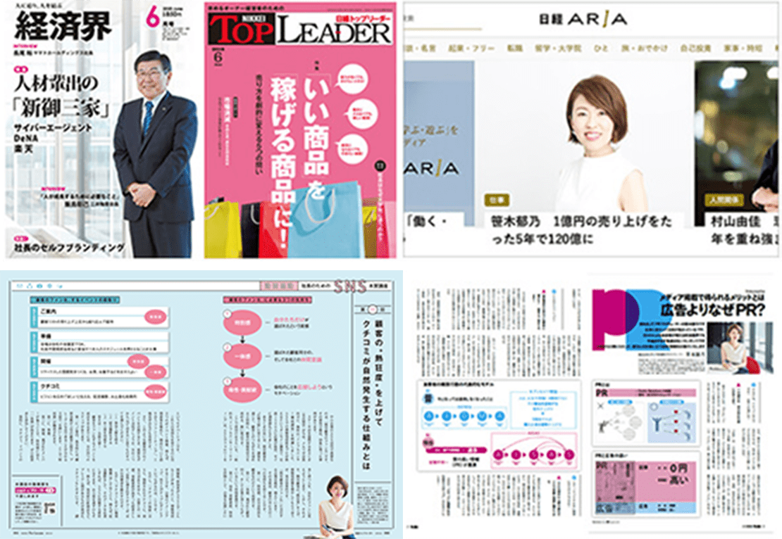 「経済界」「プレジデント」「日経トップリーダー」「日経ビジネスオンライン」「日経ARIA」「@DIME」「創業手帳」他多数。